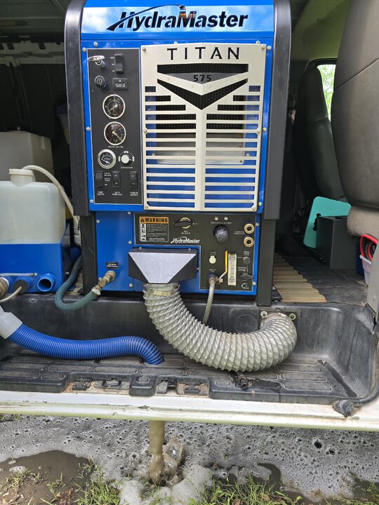 2006 Chevrolet Express 2500 with HydroMaster Titan 575. The titan runs great but does have the main heat exhanger bypassed and needs a timing adjustment. Comes with 200ft vacuum and solution hose, wand, tile spinner and stair tool. The van has 80gal fresh water tank, 3 teir stainless shelf and inside is rhino lined. The van has a new alternator, fan clutch, water pump, master cylinder and batery all replaced November 2025. The machine has new battery, spark plugs, fuel line, fuel pump and blower belts replaced in 2025.