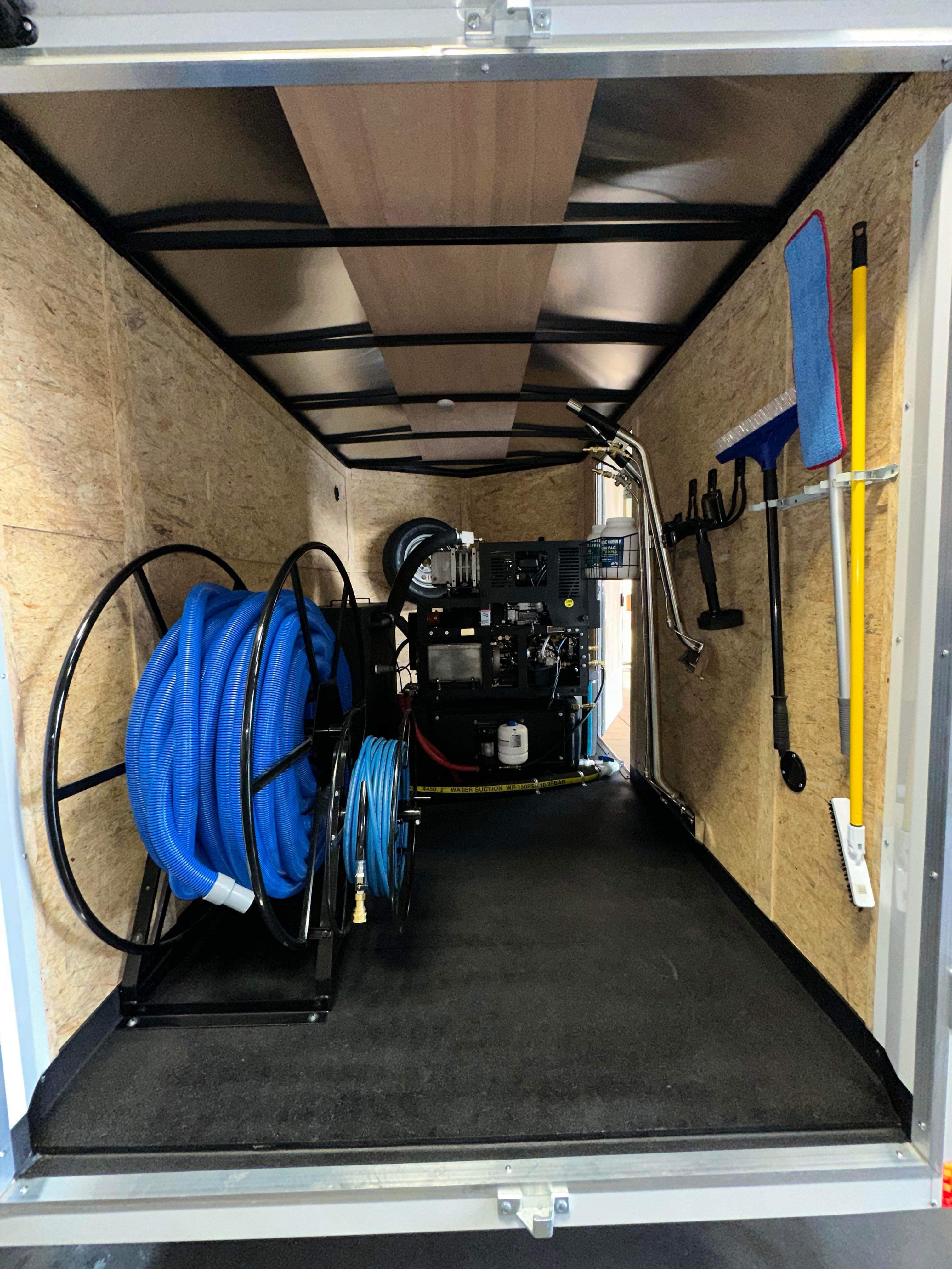 Comes with shelving , holders, NEW trailer bedliner throughout, vacuum reel, solution reel, tool hanging storage, 2 jet wand,NEW 150ft vacuum hose and NEW 150ft solution hose , NEW 50ft garden hose, NEW spare tire, NEW aluminum gas tank, 5 gallon chemical jug and holder.