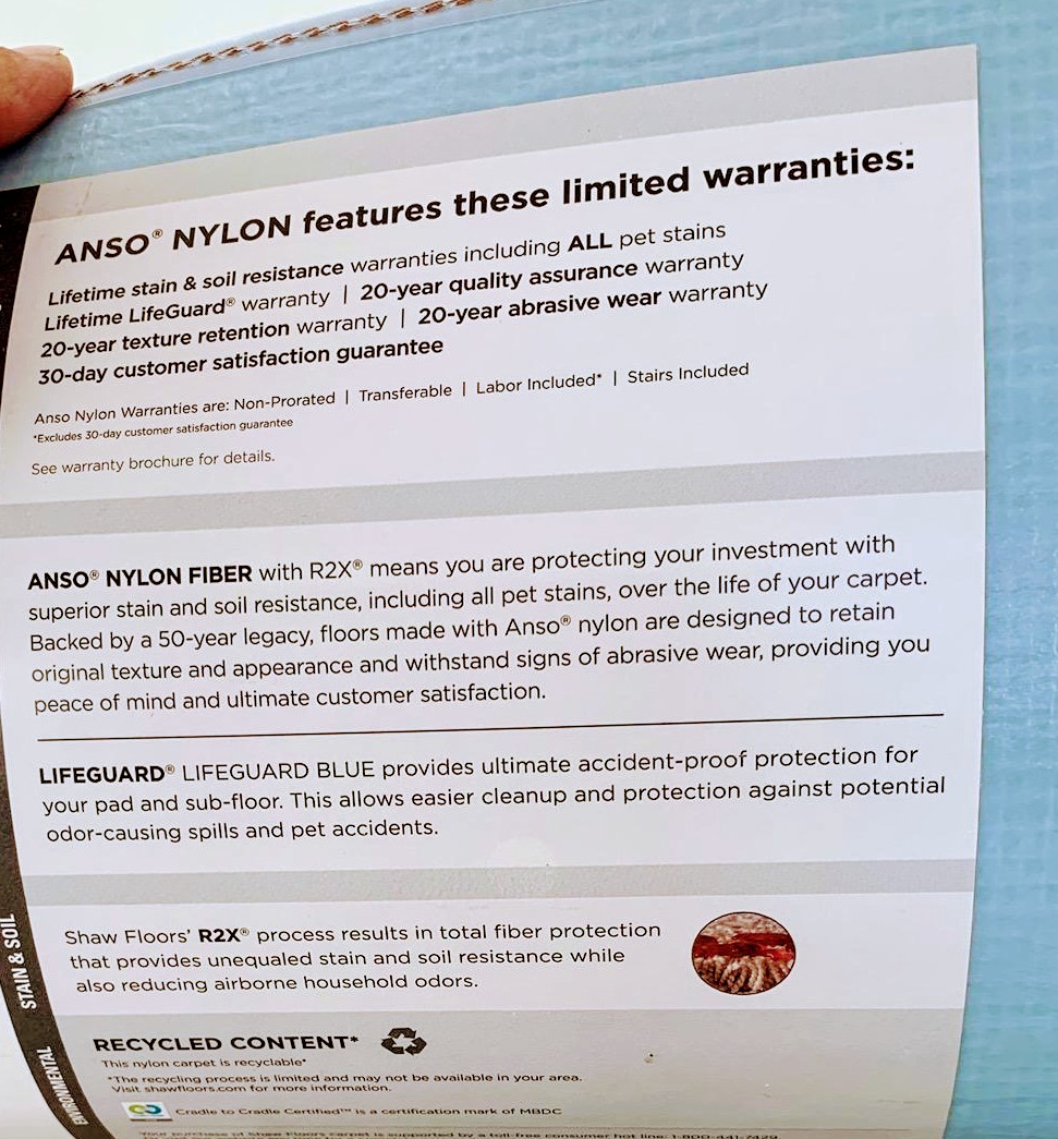 Don't worry the mills expect a customer to provide receipts for carpet cleaning every 18-24 mores for the entirety of their carpet life. No receipt, warranty void. Moreover, the warranties for the most part are pro-rated on the the life of the carpet, 20 years you can expect $.03 on the dollar spent, most won't go through the trouble. The reality to the texture retention is that the nylon fiber won't be abraded and it's right next to impossible to abrade nylon. Finally, the new fun in carpet is non-prorated warranties, triexta 25 years, shaw bellara polyester 10 years, doesn't matter the face weight or density. Personally, I just want to file claims for my customers at 20 years to make the mill blow $400 to send someone like Jim go inspect and deny the warranty. Warranties are there for customer piece of mind, instead of written on swiss cheese, should be toilet paper.