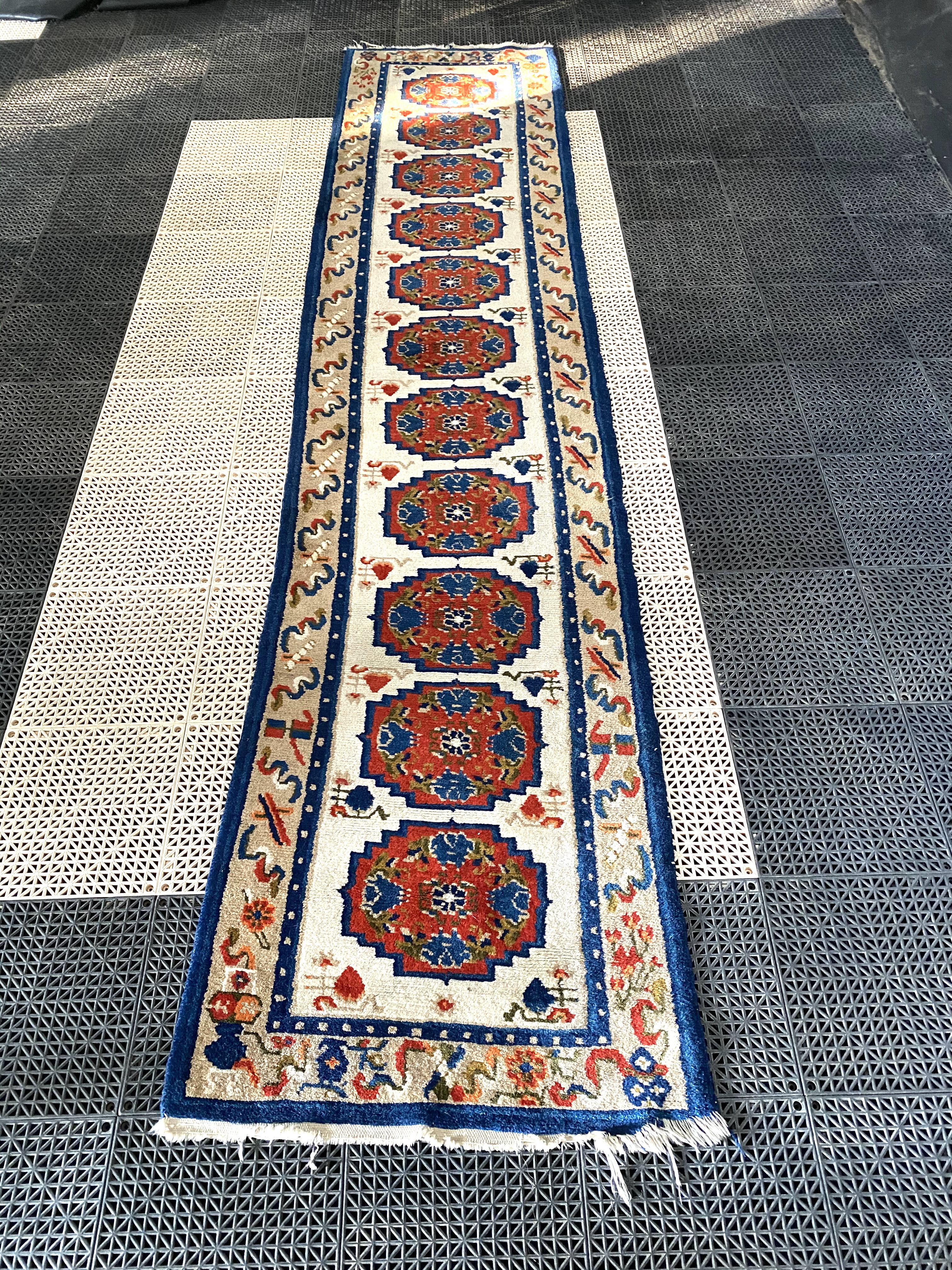Beautiful rug with bright blues and reds came in yesterday. I’m looking forward to cleaning this. Its always amazing to me how beautiful these rugs are even after being abused by animals and vacuum beater bars.