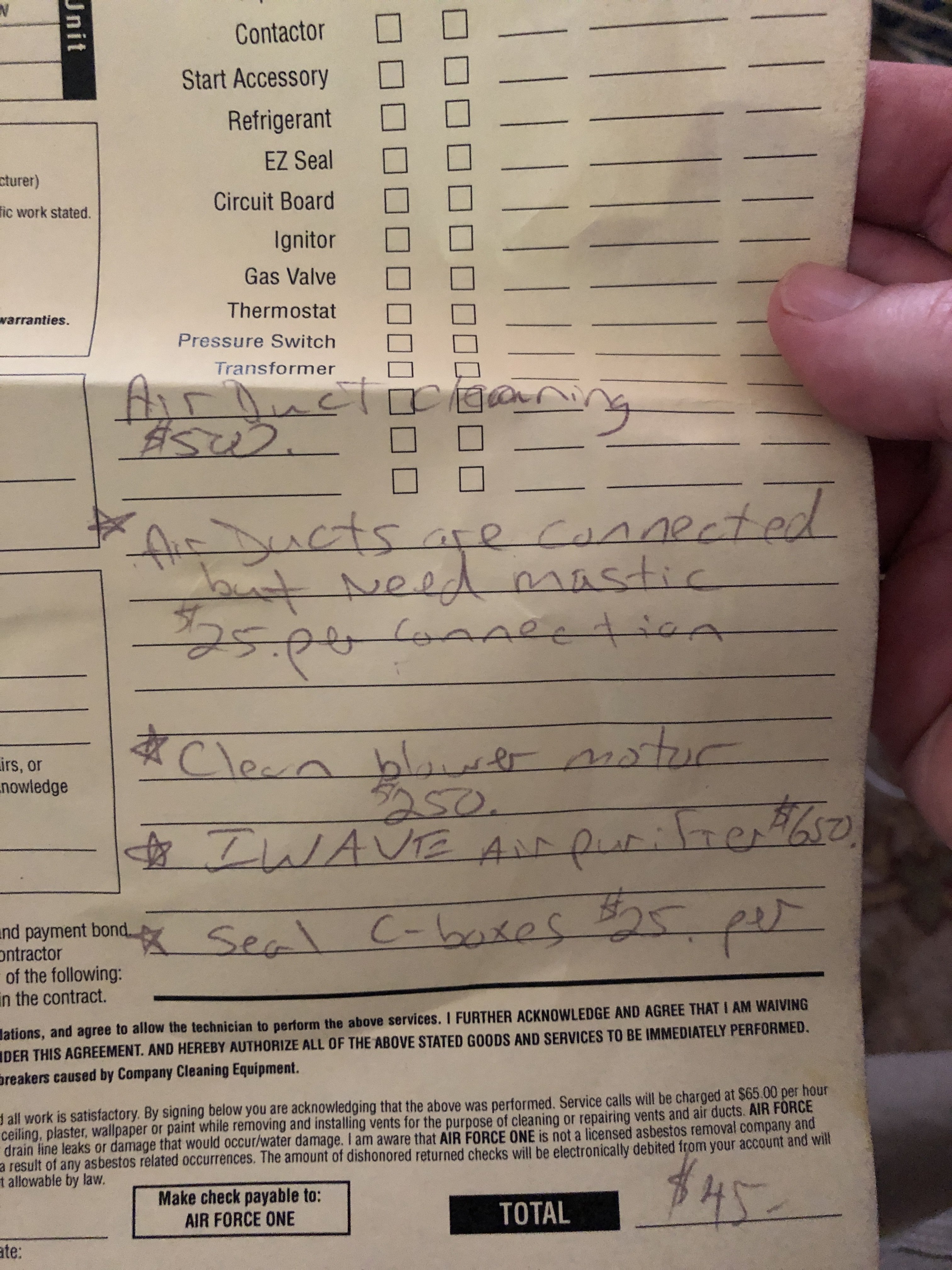 HVAC guy didn’t find any visual leaks, but didn’t pressure test the system. Told me about Iwave air purifier for the whole house that doesn’t use a UV light. Carrier unit and ducting was installed 15 years ago. Was told I could put mastic on each duct and seal C-boxes. As far as air duct cleaning, he only has the Rotovac system.