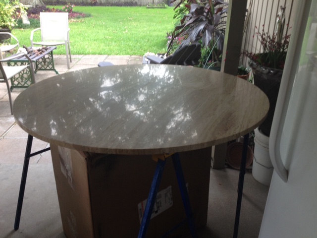 You obviously missed your natural calling; should have been a baseball coach. LOL I followed your advice to "swing for the fences"; and I seem to have hit a Grand Slam Home Run! I had gone by my local Harbor Freight to get a cheap orbital palm/hand sander, figuring the rock/stone dust would have the same effect on my good sander that pouring sand in the crankcase of my truck would have. They also had combo packs of 220, 500, 1000, and 1200 grit wet/dry silicon carbide for CHEAP and it looked like good quality stuff, so bought it. On to the local auto parts store and picked up 1500 and 2000 grit which was the finest they had. Spent about 5 to 5 hours on it and it looked REALLY GOOD. Decided to try and find some 3000 as you suggested. Found one place with 2500 so went and got it. Went through all the grades sanding dry. Did a final polish wet with the last of the 2500 grade. Now it looks even BETTER! I was only 9 when my Mother got this table; and that was 60 years ago; so I can't remember or swear to it for sure, but I don't think it was this shiney when it was brand new. The picture attached below is just wiped off and cleaned with NOTHING on it. It was taken against a very overcast sky a little after 6:00PM. You can see the reflection of that large oak tree in it nearly like a mirror. I actually noticed a squirrel running on a limb in the reflection when I was fixing to snap the pic. Believe it or not, that little $11.00 (with coupon) "Drill Master" sander held up like a champ and completed the job running strong....surprised the Hell out of me! Now I have to decide which direction to go from here. Do you have any more good advice to seal, or not to seal, with one of the many stone seal products I have seen; or any other finish protector or polish to put on it?