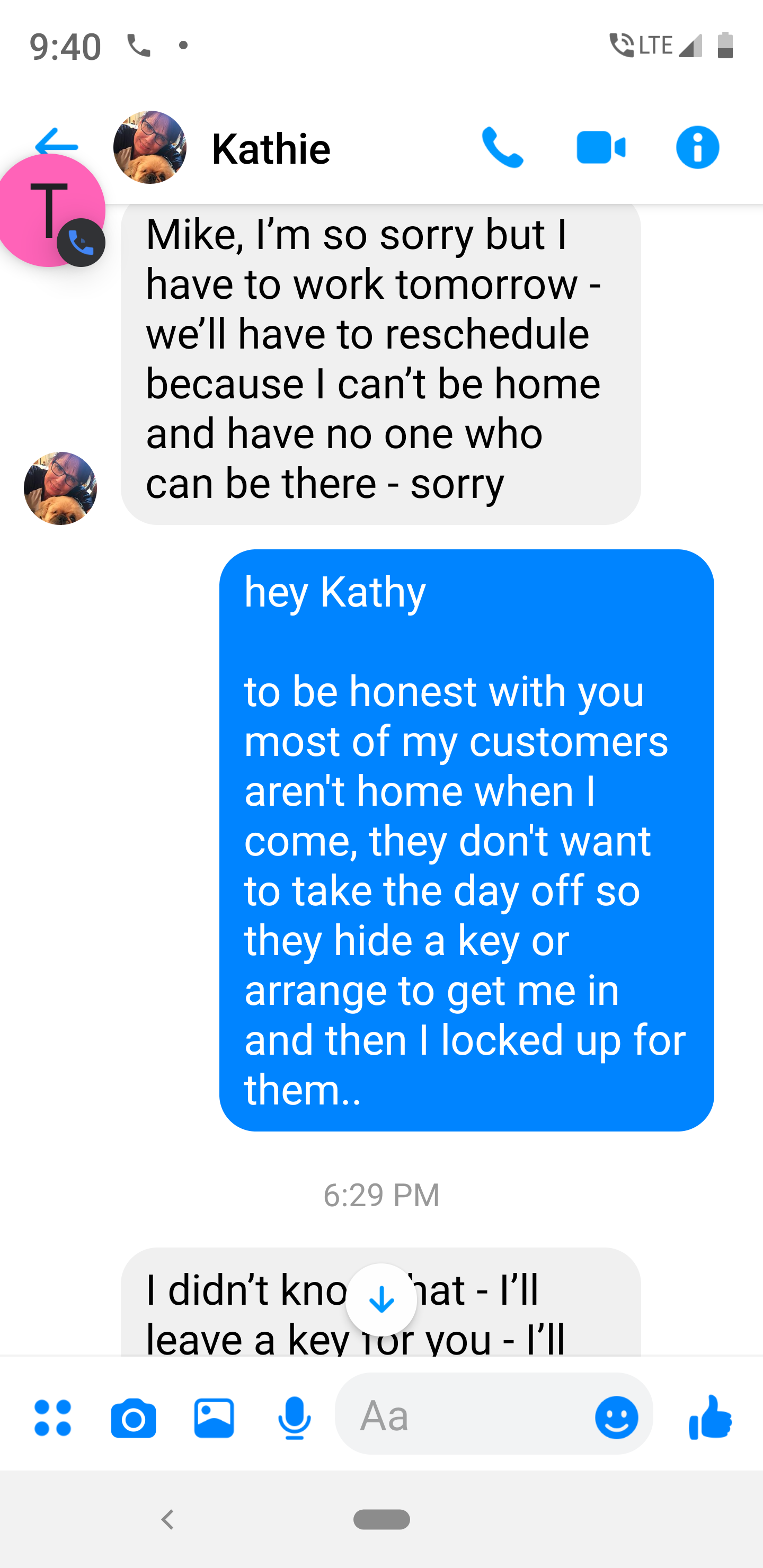Custy: "my asst. is having car issues and can't meet u today. we need to reschedule"