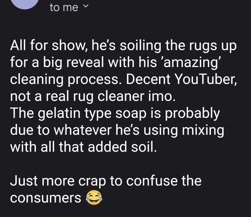 you mean that all other carpet cleaning videos on Youtube dont purposefully muddy them first?unless he is purposefully flooding/muddying them!